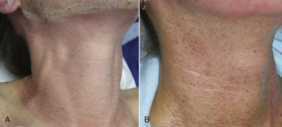 As discussed previously, resurfacing the neck is a dangerous procedure that can produce severe complications. For this reason, I never use high-energy, high-density (traditional) laser treatment on the neck, but the Active FX superficial treatment has proven very safe ( Fig. 13.19 ). A single treatment does not produce significant results, but does produce a smoother feeling skin surface. Repeated fractional CO 2 laser neck treatments can produce mild to moderate improvement of dyschromias and photodamage. The neck will never respond to laser rejuvenation as well as the face, and scarring risk is high.