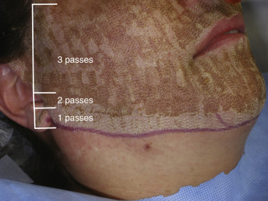 When discussing laser parameters, it is important for surgeons to understand the physics and nomenclature for laser therapy. Simply stated, fluence is the amount of energy received by a surface per unit area, which is usually expressed in joules per centimeter squared (J/cm 2 ). This can vary due to laser spot size and wattage of the laser. Density is the measurement of the amount of overlap from the computerized pattern generator. Fractional laser density is low and has no overlap, while traditional full coverage laser patterns have overlap of laser beam spots of 30% and beyond. Some lasers have a setting for hertz, which is a measure of cycles per second of the laser beam, or how fast they are generated. Passes indicate the number of times a given area of skin is treated over the top of the previous pass. A “3 pass” laser treatment would mean that a single pass was made over the entire region and repeated again for a second pass and again for a third pass. This would be analogous to painting a wall with three coats of paint. Combining these variables produces the wounding depth, thermal damage, healing, and results of the laser treatment. A high-fluence pass (7.5 J/cm 2 ) with a high density (30% overlap of laser beam spots) and 3 passes would be a very aggressive treatment, while a lighter treatment may be a single pass of a fluence of 3.5 J/cm 2 with a density of 1 (no overlap) ( Fig. 13.11 ). There are no standardized parameters from one laser to another but an understanding of fluence, density, and passes can be applied to all laser treatments for reproducible results. Increasing any of these parameters (while leaving the others the same) will result in deeper treatment. Expert laser clinicians can apply the physics of lasers with the clinical treatments and outcomes for safety and maximum result. Novice laser surgeons must remember that lasers are serious devices capable of drastic burns and scars.