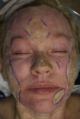 For the novice practitioner, successive debridement allows the judgment of clinical endpoints and is a good way to “learn” laser treatment, as the treated skin is continually visualized. Generally, laser treatment is halted when the skin reaches a chamois or champagne color. This is the endpoint of aggressive laser treatment and usually occurs after 3 passes but is variable ( Fig. 13.28 ). The treatment endpoint is difficult to judge without debriding the char.