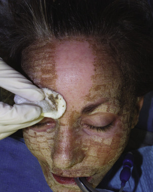In multipass LSR, the face is totally treated with a single pass before moving on to a second pass. This prevents pulse stacking, which is multiple firing of the laser over the same area, and allows the skin to cool before a second pass. Pulse stacking is never performed, as it does not allow the heat to dissipate and may cause deeper than intended tissue damage and result in overtreatment or scarring. In the evolution of laser treatment, the laser char was debrided after each pass ( Fig. 13.27 ). In a typical 3-pass treatment, the first laser pass is performed on the entire face, then the char is debrided with wet gauze until all the char is removed. A second pass is then performed and this char debrided, followed by a third pass, which is then debrided. The reasoning was that the char could serve as a heat sink and produce further thermal damage.