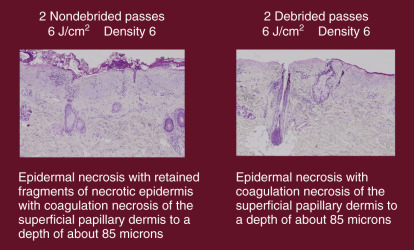 In 2008, I published the first human study showing that not debriding laser char between laser passes does not increase ablation depth or increase complications. This study involved split-face histologic examination after high-energy, high-density, and multipass CO 2 patients. One side was debrided after all passes and the other side was not debrided at all. These patients were followed clinically and histologically ( Figs. 13.29 , 13.30 ). The histologic analysis showed no difference in the ablation depth when debriding or not debriding. In addition, the undebrided eschar serves as a biologic dressing, which is more comfortable than denuded skin. Not abrading the raw skin with moist gauze also decreases postoperative discomfort and erythema. When the operator debrides after passes, the patient is essentially getting lasers plus dermabrasion, which increases the irritation. Not debriding also simplifies and shortens the laser procedure.