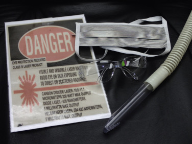 Eye protection is paramount for the surgeon, staff, and patient. The CO 2 laser technically does not require protective eye wear for the doctor and staff, as it is not a visible light output or one that can damage the retina from direct unprotected vision. Eye protection must still be used, however, in the event that the laser beam reflects off an object into someone’s eyes in the room. The reflected beam can produce the same incision or ablation of the cornea that it does on the skin. Remember, laser light bounces off shiny surfaces and for this reason, most stainless steel laser instrumentation and eye shields have a flat, dull finish.