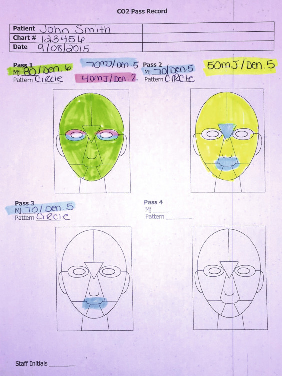 It is important to have a diagram of the face in the medical record and have the laser safety officer document the areas treated as the procedure progresses. This not only serves as part of the operative report, but prevents inadvertent under- or overtreatment. It is easy to lose track of the treated areas and the surgeon can mistakenly re-treat or undertreat a given area. It is helpful to develop a standardized treatment protocol and use it on all patients. An example would be doing the forehead first for a single pass, then going to the periorbital region, then to the cheeks, then the mouth, and finishing with the jawline. This is done for the single pass, and subsequent passes are made in the same order. This prevents making extra passes or forgetting to make an additional pass on an area. One of the laser team members should have the sole task of keeping track and recording the treated areas and making sure the intended treatments are made to all areas ( Fig. e13.4