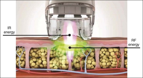 The VelaSmooth™ technology (Syneron Medical Ltd, Yokneam, Israel) is based on the simultaneous application of light energy to the tissue at a controlled infrared (IR) wavelength, conducted RF energy, and mechanical manipulations of the skin and fat layer. It was the first medical light-based device to achieve FDA approval. Bipolar RF (up to 35 W) and infrared light in the wavelength range of 700–2000 nm are used to heat the subcutaneous tissue, while vacuum suction is applied to shape the skin for optimal delivery of RF energy up to a depth of 15 mm. Proposed tissue reaction to the VelaSmooth technology is an increase in local blood supply to the subcutaneous tissue promoting an increase in fat metabolism. Eventually, the mechanical action due to suction and massage lead to a collapse of fat cell clusters and fibrous bands smoothing the skin surface.