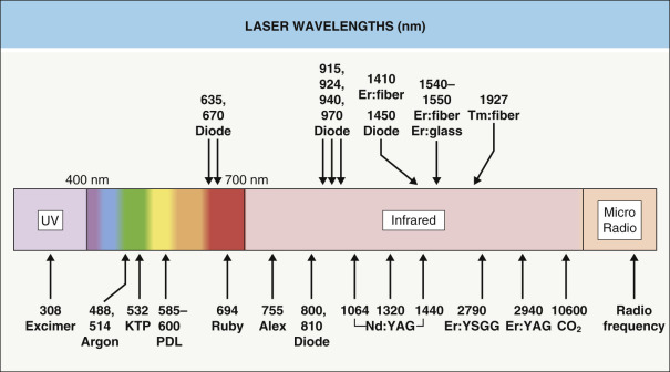 This chapter will consider laser and light applications for both medical and aesthetic purposes as related to the skin. Given the multiplicity of lasers available ( Fig. 137.1 ), the laser surgeon must understand the capabilities and limitations of each device so that the appropriate system can be selected and the parameters tailored to treat the intended target. Safe and effective laser therapy is achieved when the operator understands the nature of the target, its location in the skin, and the potential collateral damage. Other energy-based devices, such as those that utilize radiofrequency waves, intense focused ultrasound or microwaves, are also discussed.