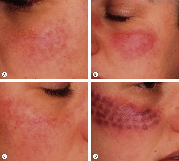 Patients frequently present with facial telangiectasias and they are most commonly associated with chronic photodamage and rosacea. However, telangiectasias also occur on the face and elsewhere in the setting of liver disease, autoimmune connective tissue disorders, surgical scars, and misuse of topical corticosteroids. Facial telangiectasias are typically located on the nose, cheeks and chin; they measure 0.1–1.0 mm in diameter and therefore are commonly treated with PDL, KTP laser, or IPL. When the PDL is used with short pulse durations, significant clearance can be achieved, albeit with significant bruising (see Fig. 137.2D ). Clearance of facial vessels can be achieved with non-purpuric fluences or treatments that employ fluences ranging from 6.5 to 8.5 J/cm 2 with longer pulse durations (6–20 ms) using 7–12 mm spot sizes. At these settings, multiple passes and/or pulse-stacking techniques are typically employed to improve efficacy. Additionally, multiple treatment sessions may be required . These techniques can be particularly beneficial for patients with recurring flushing and central facial erythema ( Fig. 137.6 ).