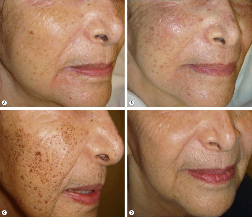 The authors’ preferred technique is to deliver multiple passes to a particular treatment area, with each subsequent pass oriented at a different angle. This allows for uniform, consistent coverage and prevents zebra-like pigmentary irregularities and skip areas. If double or triple pulses are utilized in any one area, adequate time for epidermal cooling should be allowed between passes. The observable endpoints of IPL treatment are darkening of lentigines (see Fig. 137.4B ) and either a disappearance or a darker blue appearance of telangiectasias.