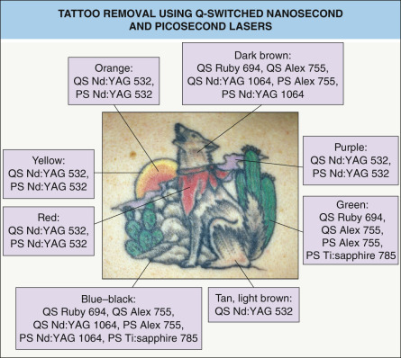Selection of the appropriate Q-switched or picosecond laser is determined by the colors of tattoo pigment to be targeted ( Fig. 137.9 ). Based on “complementary matching” of tattoo pigment, green tattoo pigment is most effectively removed by a red laser (694 nm), and red tattoo pigment is best removed with a green laser (532 nm). Blue and black pigments are removed with all three lasers – ruby, alexandrite and Nd:YAG ( Table 137.2 ). More difficult to remove are yellow and orange pigments, as these are not well absorbed by currently commercially available laser light.