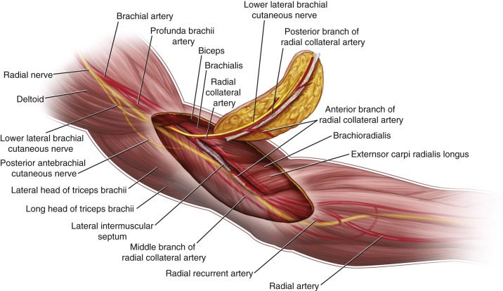 The main branch of the RCA that supplies the flap is the PRCA. This posterior branch arises from the RCA at the anterolateral border of the triceps muscle and runs distally through the lateral intermuscular septum between the triceps posteriorly and the brachialis and brachioradialis anteriorly. It supplies the overlying flap skin by four or five septocutaneous perforators along the intermuscular septum, and empties into the epicondylar and olecranon plexus. The most distal septocutaneous perforator typically branches off at approximately 4 cm proximal to that prominence.