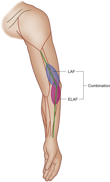 The LAF/ELAF is generally harvested as a septofasciocutaneous flap, but it can also be elevated as a pure fascial flap. In addition, it can include a fragment of the posterolateral distal humerus as an osseofasciocutaneous flap. It is possible to integrate a segment of the lateral head of the triceps muscle and also a segment of vascularized triceps tendon. Enclosing the ARCA also enables integration of a segment of brachialis or brachioradialis muscle. The inclusion of the LBCN or PACN enables the design of a neurosensory flap.