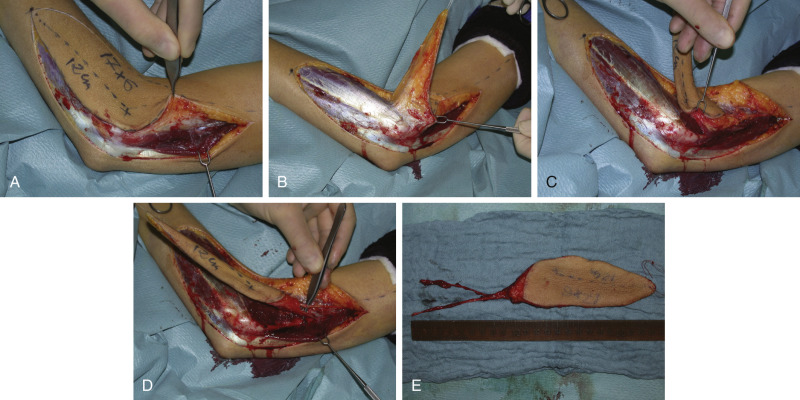 The use of the ELAF, including the proximal forearm region, enables a lengthening of the pedicle up to 16 cm as compared with the conventional LAF (6 cm). It is important to include the distal septocutaneous perforator above the lateral epicondyle, harvesting the ELAF.