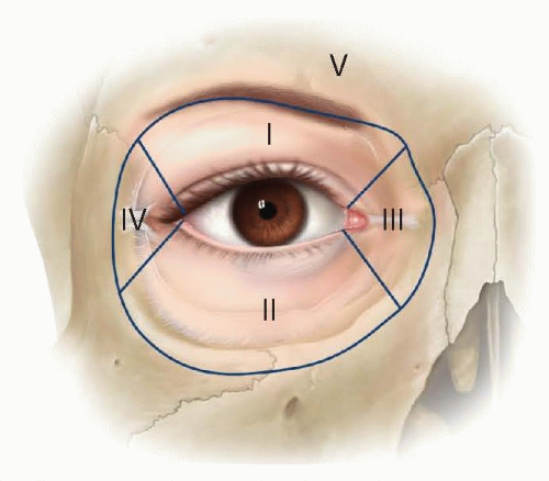 • The eyelids and surrounding structures can be divided into five anatomical zones (FIG 1).1,2 Zone I and zone II represent the upper and lower eyelid, respectively. Zone III represents the medial canthus and lacrimal drainage system. Zone IV includes the lateral canthal region and lateral retinaculum. Zone V represents the surrounding periorbital structures and includes the forehead, brow, glabellar, temple, malar, and nasal regions.