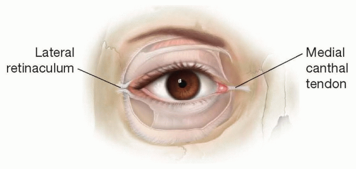 • The lateral canthus or lateral retinaculum (zone IV) is a three-dimensional fibrous structure that connects the upper and lower tarsal plates to the Whitnall tubercle, located 8 mm posterior to the lateral orbital rim (FIG 2). These structures converge at the lateral canthal angle, typically approximately 1.5 to 2.0 mm above the medial canthal angle. This aesthetically pleasing and favorable relationship of the lateral canthus above the medial canthus is often referred to as a positive canthal tilt. When the lateral canthus is at the level of or below the medial canthus, this is referred to as neutral or negative canthal tilt, respectively. It is the lower eyelid portion of the lateral retinaculum or the “inferior retinaculum” that is the focus of the lateral canthopexy or canthoplasty techniques that will be described in this chapter.