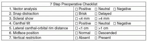 • The physical exam should be performed with the patient sitting in an upright, relaxed position and should begin with an assessment of visual acuity, pupillary reflexes, extraocular muscle movement, and an intact Bell phenomenon.3 A focused lower eyelid exam should document the presence of malar bags, fat herniation, dermatochalasis, tear trough deformities, and skin pigmentation. In addition, the senior authors have previously identified seven key features that should be assessed in patients undergoing lower eyelid procedures and include the following: canthal tilt, vector analysis, scleral show, tarsoligamentous integrity, lateral canthal-orbital rim distance, midface position, and vertical restriction.2 This standard preoperative checklist is provided in FIG 3.