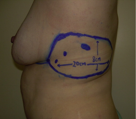 The flap is designed with the patient in the upright position. It is important to mark the patient prior to positioning on the operating table as this provides the surgeon with the opportunity to assess lateral thoracic bulge. Immediately posterior to the lateral breast at the anterior axillary line a handheld 8 MHz Doppler is used to locate signals at the anterior edge of the LD. Signals in this area can be either perforators off of the thoracodorsal, a direct cutaneous branch from the axillary artery, or an intercostal perforator. One, two or three appropriately placed signals are selected and the flap is designed around them. The anterior apex of the flap is adjacent to the lateral breast or breast flap. The flap is oriented horizontally within the bra line as an ellipse with a width of 7–10 cm and length of 15–20 cm ( Fig. 7.1 ).