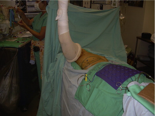 The patient is placed on the operating room table in the supine position, with a bolster under the ipsilateral chest. The ipsilateral arm is prepped into the field with the use of a stockinet cover ( Fig. 7.2 ). Beveling is used to maximize the amount of subcutaneous fat harvested. The flap is elevated from posterior to anterior at the level of the latissimus fascia. When a vessel is encountered it is evaluated for suitability in terms of its size. When an appropriate vessel is selected, the dissection is continued down through the LD. The muscle fibers are gently separated, while preserving the anterior edge of the muscle. When the dissection reaches the thoracodorsal artery and vein, great care must be taken to preserve the thoracodorsal nerve. The dissection continues superiorly toward the axillary vessels; the longer the pedicle dissection, the greater the arc of rotation. The anterior edge of LD must be separated for a sufficient length to enable the flap to be passed through ( Figs 7.3 and 7.4 ). The flap is then placed either behind the breast or reconstructed breast, or used to fill in a contour defect.