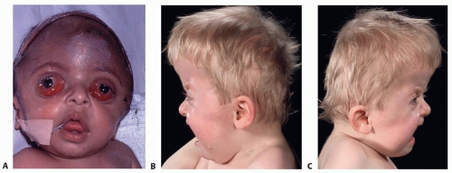 FIG 2 • A. Exorbitism secondary to shallow orbits. B,C. Lateral views of a patient with Apert syndrome. Midfacial retrusion and shallow posterior fossa are evident.