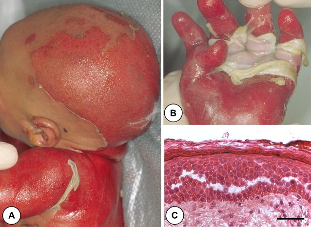 A single case of lethal acantholytic epidermolysis bullosa (LAEB) was born to nonconsanguineous parents and presented with rapidly progressive generalized epidermolysis, which started at the time of the vaginal delivery. Within 24 hours, more than two thirds of the infant’s skin was denuded, with a positive Nikolsky’s sign. There were no intact blisters or vesicles. Instead, there were areas of large sheets of detached skin with superficial red wound surfaces ( Fig. 1 A). The skin on the hands and feet had detached in a glove and stocking pattern ( Fig. 1 B). No excessive granulation tissue was noted and some sites resembled aplasia cutis. Clinical assessment also revealed complete absence of scalp hair, eyebrows, and eyelashes, although there were some discrete follicular openings on the scalp. All finger- and toenails had shed. Three triangular natal teeth were noted along with extensive erosions affecting the oral cavity. Erosions were also present on the glans penis. Over the first few days of life the skin erosions extended to more than 90% of the surface area, which led to loss of profuse amounts of fluid from the eroded skin. Ten days postpartum the child died. Autopsy revealed extensive suprabasal acantholytic separation within several epithelia, including the mouth, epiglottis, larynx, lung, gastrointestinal tract, and bladder. Cardiac dilatation was noted, but the changes in the heart were attributed to the large amounts of intravenous fluid given to compensate for the cutaneous fluid loss. The cause of death was considered to be multiorgan failure precipitated by heart failure, but there was no evidence of infection, either cutaneous or systemic. Neither parent of this infant had any cutaneous, hair, or cardiac abnormalities.