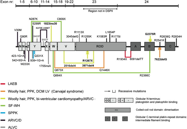 Molecular screening of DSP revealed two heterozygous mutations in the last exon (exon 24). The patient was a compound heterozygote for the mutations p.Arg1934X and a 2–base pair deletion, c.6370delTT, which led to a premature termination-codon 27 amino acids downstream ( Fig. 3 ). Nevertheless, reverse transcription–polymerase chain reaction showed that both mutant transcripts were detectable in the proband’s keratinocyte complementary DNA, indicating that neither mutation resulted in DSP haploinsufficiency by nonsense-mediated messenger RNA decay. Instead, the transcripts encoded for truncated DSP proteins (detectable by immunoblotting) that lacked the C-terminal tail. The nonsense mutation led to truncation at the end of the rod domain and thus lacked all three intermediate filament-binding subdomains (see Fig. 3 ), whereas the frameshift mutation truncated the protein shortly after the start of subdomain A and therefore lacked subdomains B and C within the keratin filament association region. These transcripts were translated into truncated proteins, confirming that the pathology of LAEB involved truncation of the DSP tail, and that the clinicopathologic abnormalities were a direct consequence of failure of intermediate filament attachment to the desmosomal inner plaques.