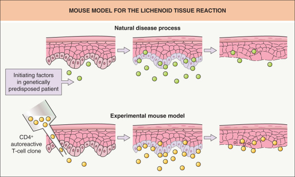A murine model of LP has been established by employing autoreactive T cells capable of producing interferon-γ (IFN-γ) and tumor necrosis factor-α (TNF-α) ( Fig. 11.1 ) . Intradermal inoculation of CD4 + autoreactive T-cell clones into the footpads of syngeneic mice can induce local histologic changes similar to LP or lichenoid skin diseases. In this model, the autoreactive T cells can respond to self MHC class II antigens constitutively expressed on macrophages and Langerhans cells, and they migrate into the epidermis, resulting in epidermal injury. These T cells, therefore, can induce LP-like lesions without any alteration in the antigenicity of the epidermis. In subsequent studies, desmoglein-specific T cells were also capable of inducing LP-like changes histologically . Thus, LP could be induced by different types of T cells – those that specifically target antigens constitutively expressed in the epidermis but also T cells that target antigens not expressed within the epidermis.