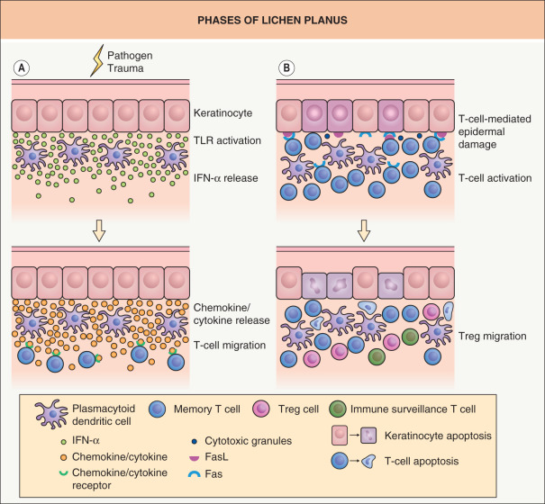 A critical event in the initiation of immune responses in LP lesions is for memory T cells to migrate from the circulation into a particular skin site. Release of type 1 IFNs, such as IFN-α, from activated plasmacytoid dendritic cells (pDCs) and keratinocytes may be critical in inducing skin-directed migration of effector memory T cells ( Fig. 11.2A ). Stimulation of TLRs expressed on pDCs and keratinocytes by pathogens or endogenous ligands (released via skin damage) represents one of the earliest events and it is sufficient to induce type 1 IFN production. Type 1 IFN signaling and type 1 IFN-inducible chemokines (e.g. IP-10/CXCL10) then serve to recruit chemokine receptor CXCR3-expressing effector memory T cells (Th1 cells) into the skin via CXCR3/IP-10 interactions ( Table 11.3 ). A number of other molecular interactions, such as CCR4/TARC, CCR10/CTACK and LFA-1/ICAM-1 expressed on T cells and keratinocytes, respectively, have also been implicated in the recruitment of memory T cells and pDCs to the dermal–epidermal junction . Because IFN-α from pDCs induces IFN-γ production by T cells and IFN-γ also sustains IFN-α production, a positive feedback loop may be operational within LP lesions. This ordered sequence of events provides a possible explanation for why LP lesions develop within traumatized sites and virally induced lesions.