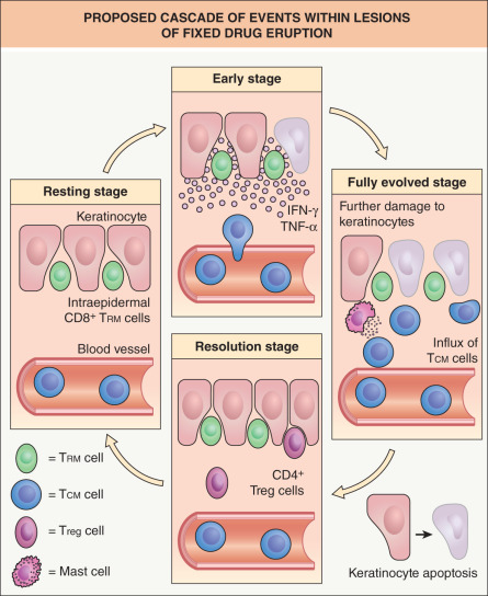 Of note, while the epidermotropic migration of effector T cells leading to epidermal damage in lichenoid tissue reactions is clearly a complicated, multistep process, the latter can be bypassed (at least in part) in the case of fixed drug eruptions (FDE). This is because effector CD8 + T cells responsible for the epidermal damage persist as a stable population within previously affected sites, even when the skin becomes normal-appearing . In particular, CD8 + TRM cells (see above) populate the epidermis of “resting” FDE lesions and although these cells are the principal mediators of localized tissue damage, CD4 + and CD8 + TCM cells, recruited from the circulation, also contribute to the epidermal damage ( Fig. 11.3 ).