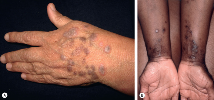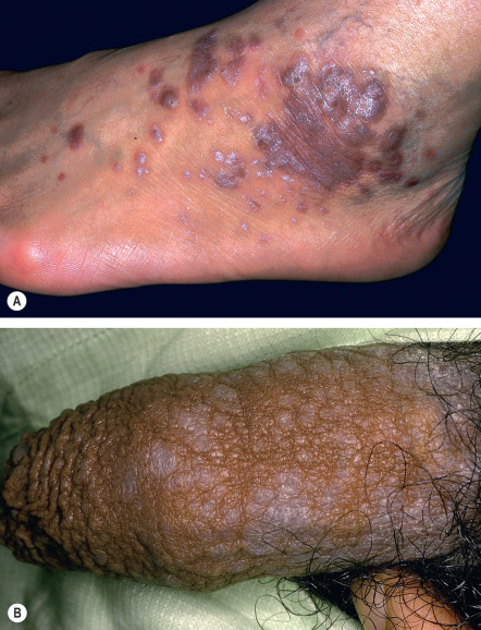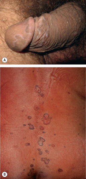 The most common sites of involvement are the flexor wrists and forearms, the dorsal hands, the shins, and the presacral area. Mucous membranes, especially the oral mucosa (see below), are affected in more than half of patients, and this is often the only site of disease. Lesions are also commonly seen on the glans penis ( Fig. 11.7A ), where they can have an annular or figurate configuration and may become erosive. Several of the distinctive clinical variants of LP are discussed separately.