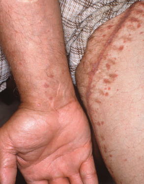Because lesions are usually widely distributed and disseminate rapidly, this form is also known as exanthematous or eruptive LP. The commonly affected areas include the trunk ( Fig. 11.8 ), the inner aspects of the wrists and the dorsal feet. Reports in the literature of this variant probably include lichenoid drug eruptions. The clinical course is usually self-limited, and in general lesions resolve with hyperpigmentation within 3 to 9 months.