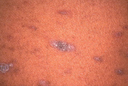 Flat-topped violaceous papules and plaques favoring the wrists, forearms, genitalia, distal lower extremities, and presacral area