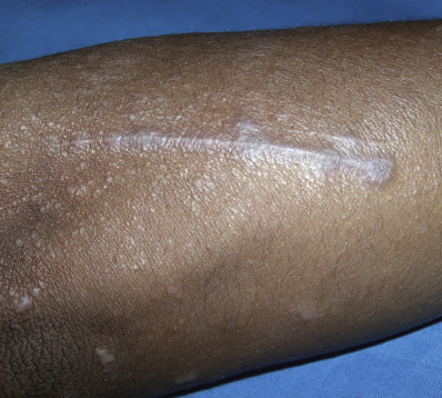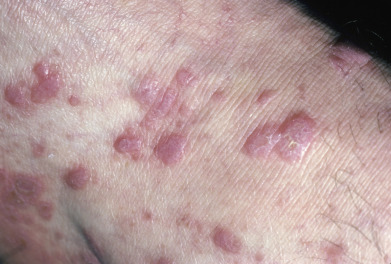 Small, linear lesions caused by the Koebner phenomenon often occur in classic LP. Limitation of LP to one band or streak has also been described in fewer than 1% of patients of European descent. In Japan, however, up to 10% of cases are linear, and in India, 7% of childhood cases of LP are linear. Although originally described as following dermatomes (zosteriform), the lesions actually follow lines of Blaschko. It is more common in children but also occurs in adults. Papules with varying degrees of overlying hyperkeratosis or simple hyperpigmentation may be the presenting manifestations. There are often “skip areas” of normal skin between the individual lesions. Ipsilateral mucosal disease may be seen.