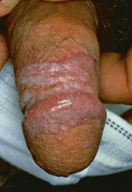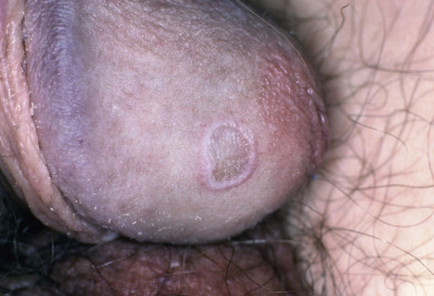 Annular LP occurs in 3%–7% of patients with LP, and is more common in men (90% of cases). Lesions with this configuration favor the axilla, penis/scrotum ( Fig. 12.6 ), and groin. LP lesions of the mucosa, scalp, and nails are rare in patients with annular LP. Patients usually have fewer than 10 lesions. Most patients with annular LP are asymptomatic. The ringed lesions are composed of small papules and measure about 1 cm in diameter. Central hyperpigmentation may be the dominant feature. They may coalesce to form polycyclic figures. Annular lesions may also result from central involution of flat papules or plaques, forming lesions with violaceous, elevated borders and central hyperpigmented macules. A rare type of annular lichenoid dermatitis which may resemble morphea, inflammatory vitiligo, or mycosis fungoides has been described in pediatric patients termed annular lichenoid dermatitis of youth; one report from a region with endemic borrelia suggested a possible etiologic link, which has not been proven.