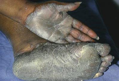 The primary lesions of LP are characteristic, almost pathognomonic: small, flat-topped, polygonal papules ( Fig. 12.1 ). The color of the lesions initially is erythematous. Well-developed lesions are violaceous, and resolving lesions are often hyperpigmented, especially in patients with darker skin. The surface is glistening and dry, with scant, adherent scales. On the surface, gray or white puncta or streaks (Wickham striae) cross the lesions—a feature seen more easily with dermoscopy. Lesions begin as pinpoint papules and expand to 0.5–1.5 cm plaques. Infrequently, larger lesions are seen. There is a predilection for the flexor wrists, trunk, medial thighs, shins, dorsal hands, and glans penis ( Fig. 12.2 ). The face is only rarely involved, with lesions usually confined to the eyelids and lips. The palms and soles may be affected with small papules or hyperkeratotic plaques ( Fig. 12.3 ). Certain morphologic patterns favor certain locations (e.g., annular lesions favoring penis; keratotic lesions favoring anterior shins). Lesions are often bilateral and relatively symmetric. The Koebner phenomenon occurs in LP ( Fig. 12.4 ). Oral mucosal involvement is common.