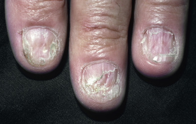 Nail changes are present in approximately 5%–10% of patients ( Fig. 12.5 ), with fingernails more often affected than toenails. Involvement of the nail can occur as an initial manifestation, especially in children. Longitudinal ridging and splitting are most common, seen in 90% of patients with nail involvement. Onycholysis and subungual debris may be present, indicating involvement of the nail bed. The lunulae are red in 30% of patients with nail LP. Involvement of the entire matrix may lead to obliteration of the whole nail plate (anonychia). Pterygium formation is characteristic of LP of the nails, but seen in only about 20% of patients. The nail matrix is destroyed by the inflammation and replaced by fibrosis. The proximal nailfold fuses with the proximal portion of the nail bed. Dermoscopy can show pitting of the nail matrix, tachyonychia, chromonychia, onycholysis, or splinter hemorrhages. LP may be a cause of some cases of 20-nail dystrophy of childhood. In the absence of periungual lesions or pterygium formation, 20-nail dystrophy usually resolves spontaneously, and frequently in these children, no other stigmata of cutaneous or mucosal LP are found.