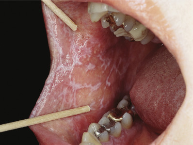 Oral mucosal LP is the most common form of mucosal LP, and it is usually chronic. Between 10% and 15% of patients with oral LP will also have skin lesions. Women represent 50%–75% of patients with oral LP. Oral LP in women begins 10 years later than in men (age 57 vs. 47). Oral lesions may be reticulate (reticular), the oral version of Wickham striae ( Fig. 12.8 ), erythematous (atrophic), or ulcerative (erosive) ( Fig. 12.9 ); lesions are often bilateral and symmetric. The most common pattern in oral LP is the ulcerative form (40% of patients). Usually, reticulate and erythematous lesions are found adjacent to the ulcerative areas. The erythematous pattern is the predominant pattern in 37% of patients, but almost always, reticulate lesions are also seen in these patients. In oral LP, the “classic” reticulate lesions are most prominent in 23% of patients. Rarely patients may have a white plaque mimicking leukoplakia, bullous, or papular lesions. Symptoms are least common in patients with reticulate lesions; 23% are symptomatic, and then only when the tongue is involved. All patients with erosive lesions are symptomatic, usually with burning or pain. Patients may simultaneously have several patterns, so patients are characterized by the primary form they exhibit. Lesions appear on any portion of the mouth, and multisite involvement is common. The buccal mucosa is involved in 90%, the gingiva in more than 50%, and the tongue in about 40%.