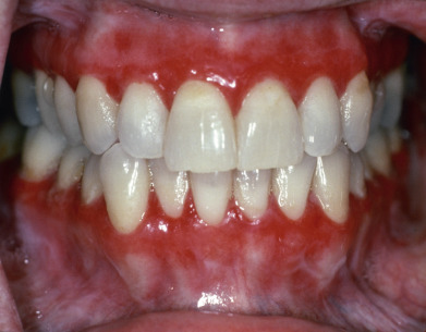 On the gingiva, LP may produce desquamative gingivitis (see Fig. 12.9 ). Gingival involvement is particularly difficult to diagnose and often requires biopsy for both histology and DIF to confirm the diagnosis and exclude other autoimmune causes of desquamative gingivitis. Gingival involvement is associated with accelerated gingival recession. Mechanical injury from dental procedures and poorly fitting appliances may trigger or exacerbate gingival LP. On the tongue and palate, lesions are often mistaken for leukoplakia. The lower lip is involved in 15% of oral LP patients, but the upper lip in only 2%. Lower lip LP is frequently mistaken for actinic cheilitis. Imiquimod treatment can lead to exacerbation of the labial LP, with extensive erosion and crusting. Oral LP is stable but chronic, with fewer than 3% of patients having a spontaneous remission in an average 5-year follow-up. Periodontitis appears to exacerbate oral LP, especially gingival disease. Plaque control either by the patient after training or by a dental professional improves the clinical appearance and pain.