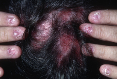 Lichen planopilaris (LPP) is lichen planus involving the follicular apparatus. Most cases involve the scalp, and LPP is an important cause of cicatricial alopecia ( Fig. 12.11 ; see Chapter 33 ). From 70%–90% or more of affected patients are women, usually about age 50. The oral mucosa may be involved in 7%–27% of patients, and 20%–40% of patients have cutaneous involvement. Patients often demonstrate perifollicular erythema and scale with progressive scarring; dermoscopy may reveal subtle signs of the folliculocentric inflammation. As with classic LP, there are reports of trauma inducing LPP. Patients may have lesions scattered throughout the scalp, clustered centrally, or on the margins; one study of 80 patients showed the FFA variant in 31% of patients with LPP. FFA is considered a variant of LPP markedly more common in postmenopausal women, with rare skin-colored papules on the upper face often lateral to the eyes, frequent loss of eyebrows, and occasionally loss of axillary and/or pubic hair. One study demonstrated an androgen excess in LPP and an androgen deficiency in patients with FFA. Graham-Little-Piccardi-Lasseur syndrome is a rare variant of LPP of the scalp with coexistent keratosis pilaris–like LPP lesions on the skin. Patients may rarely present with localized linear LPP. The rarest variant of LPP is lichen planus follicularis tumidus, formerly called agminate lichen follicularis with cysts and comedones. This presents in the retroauricular area and on the cheeks of middle-age women, where the lesions appear as tumid, red-violet plaques covered with numerous small, white-yellow cysts and comedones. The lesions resemble the plaques seen in Favre-Racouchot syndrome and phymatous cystic rosacea. The ears, chin, and scalp can be similarly involved. Other areas of LP of the skin and nails can occur in the same patient, and these may appear at about the same time. Histologically, a dense lichenoid infiltrate surrounds the follicles and cysts of the affected skin. The cysts are considered secondary to the lichenoid inflammation. Favre-Racouchot syndrome, follicular mucinosis, and LE must be distinguished histologically from LPP. LPP treatment often involves potent topical corticosteroids and/or intralesional injections, with systemic options including hydroxychloroquine, tetracycline-class antibiotics, retinoids, pioglitazones, and sometimes suppressive agents such as cyclosporine, mycophenolate, methotrexate, or systemic steroids. FFA has been treated with 5-α reductase inhibitors as well. Hair transplantation may be an option once the inflammation is controlled.