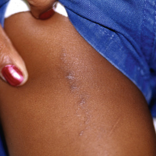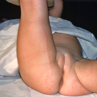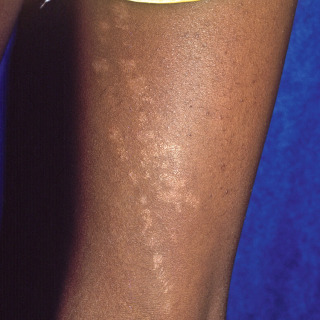 Patient with linear lesions of lichen striatus on the upper thigh demonstrating subtle hyperpigmentation.