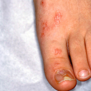 • Rare patients may demonstrate extension to a contiguous fingernail or toenail, with onychodystrophy manifesting as thinning, splitting, longitudinal ridging, or onycholysis ( Fig. 17.4 ).