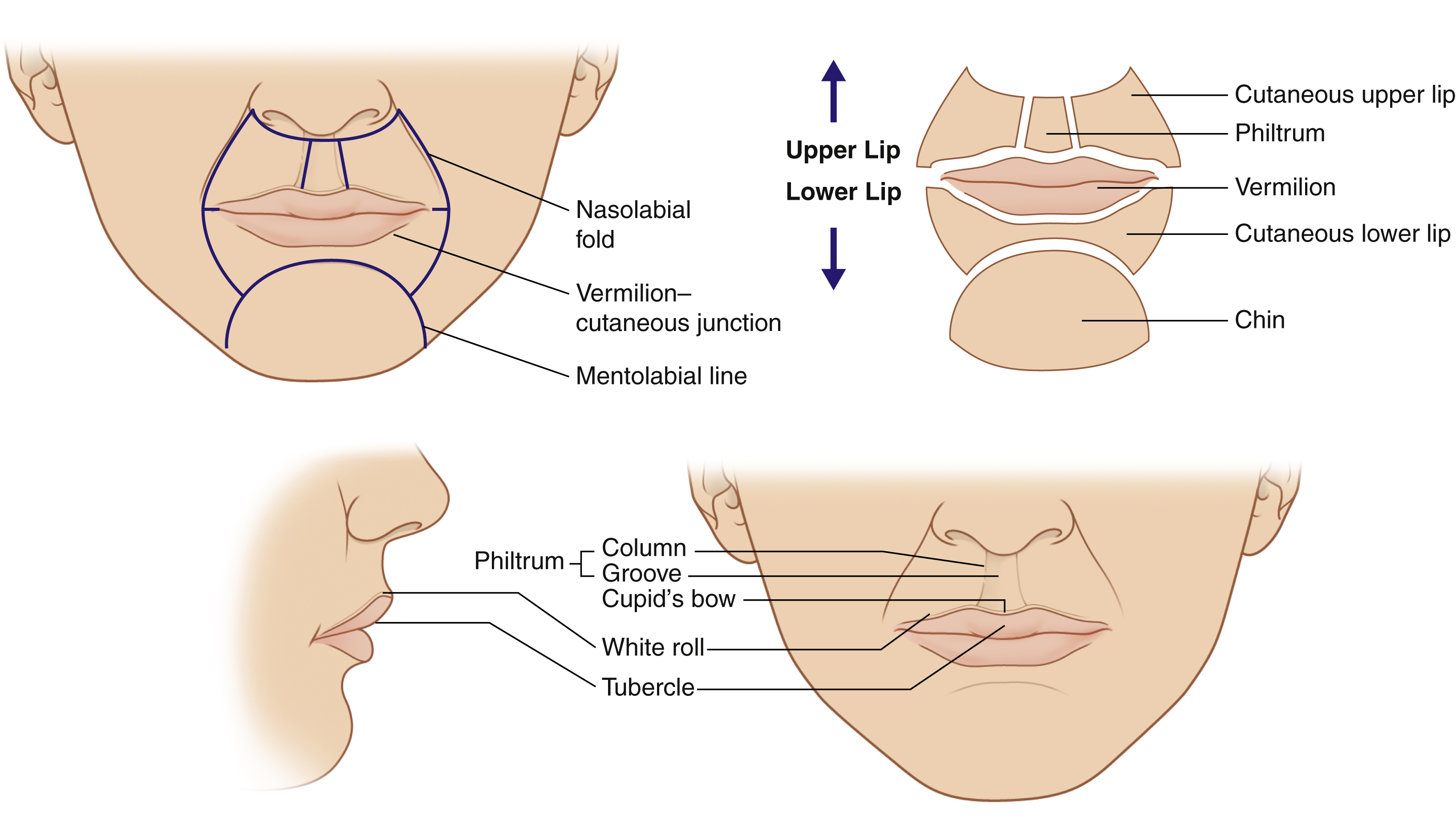 The upper lip is derived from two distinct structures, namely the paired maxillary and nasomedial processes. Fusion of these processes gives rise to the characteristic features of the upper lip, such as the philtral columns, philtral dimple, Cupid’s bow and white roll. The lower lip is formed from fusion of the paired mandibular processes, which result in a less defined lower lip. The topographical landmarks of the lip are illustrated in Fig. 29.1 .