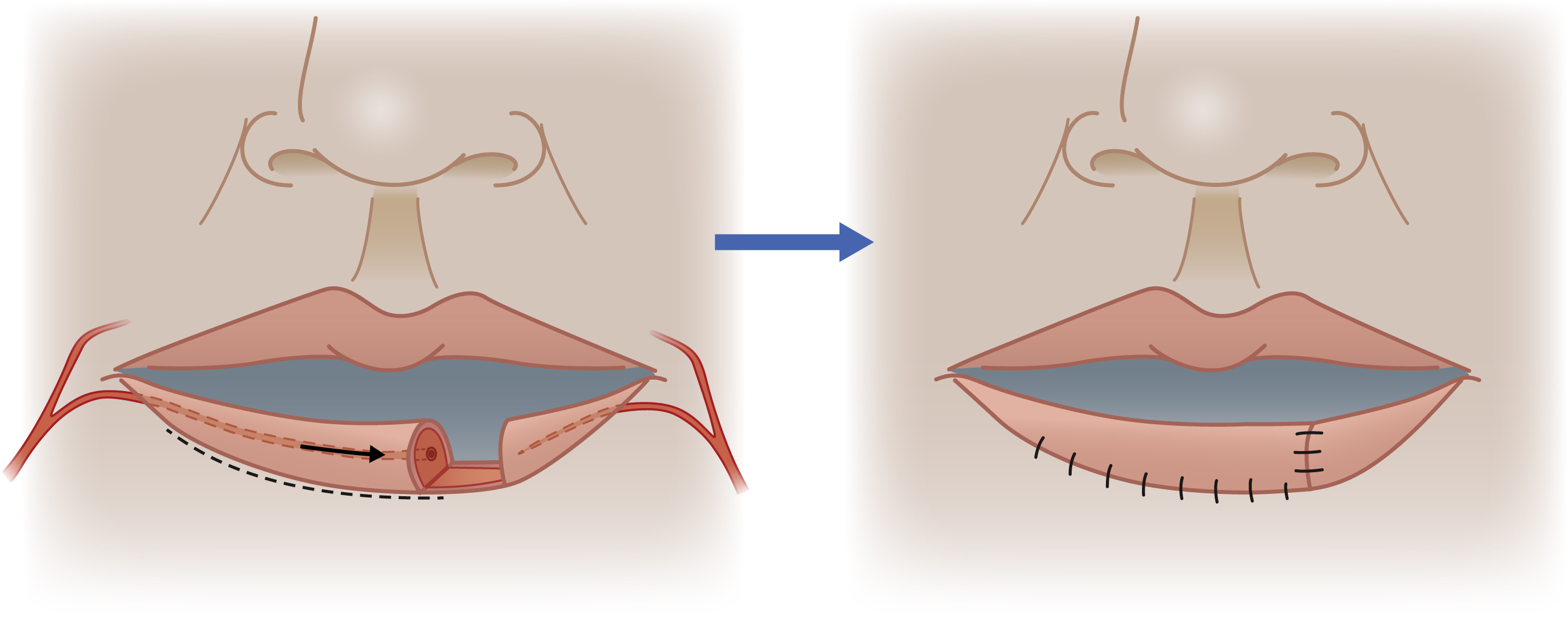 Large superficial defects confined to the vermilion can be left to heal by secondary intention, and tend to heal within 3–4 weeks with a good cosmetic result.