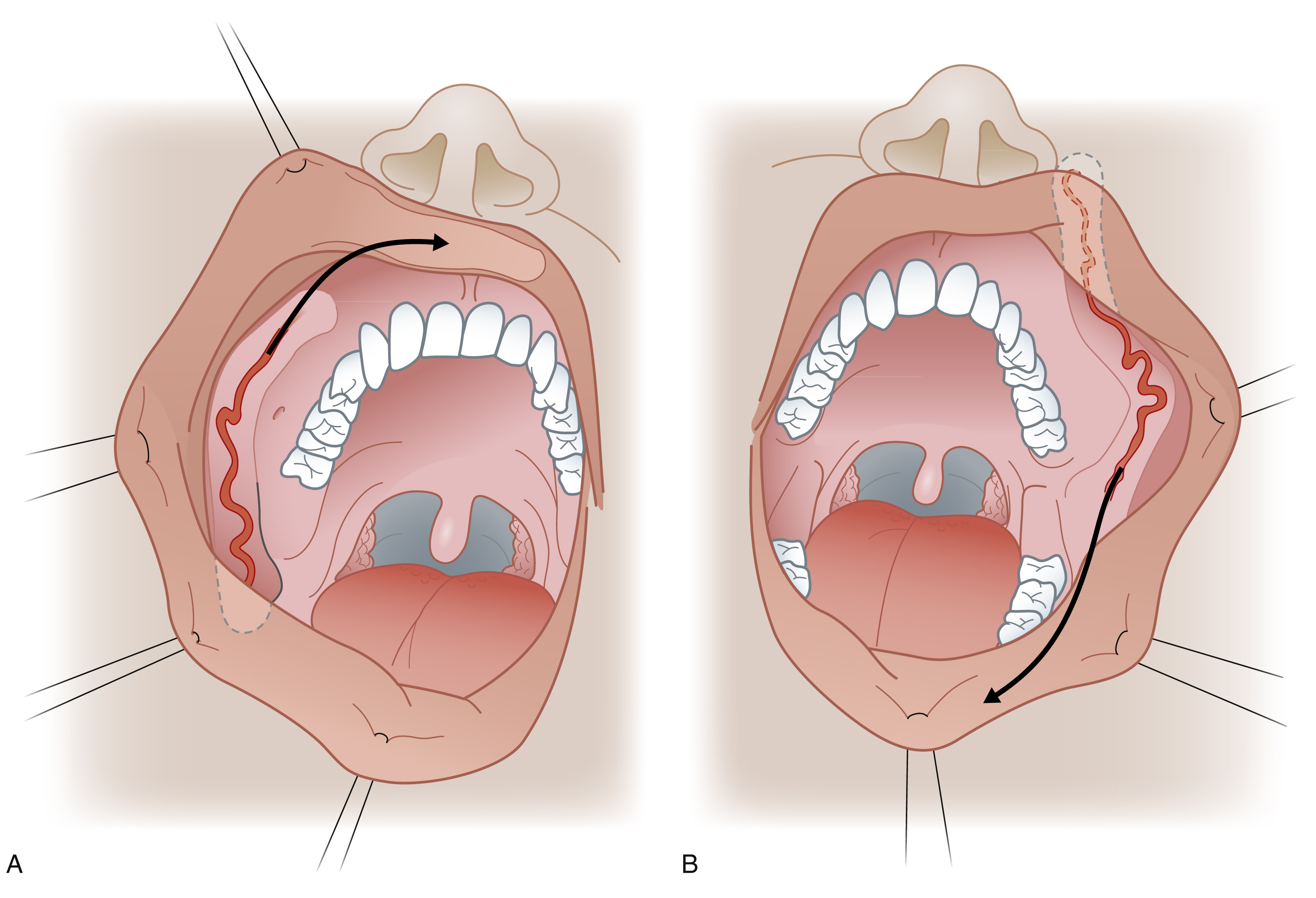 The facial artery myomucosal flap (FAMM) described by Pribaz in 1992 is a good option for vermilion defects of more than 50%.This flap can also be used for total vermilion reconstruction by raising bilateral flaps. The FAMM flap is a composite flap, which is raised from the lateral cheek, based on the facial artery as it courses though the cheek lateral to the buccinator muscle. It consists of mucosa, submucosa, a small amount of buccinator, a segment of the facial artery and venous plexus. It may be used as a superiorly based flap, which has retrograde perfusion via the angular artery, for the upper lip. Alternatively, the inferiorly based flap based on the facial artery is used for the lower lip. Wide flaps, up to the entire width of the cheek, and up to 7–8 cm in length, can be raised safely but the authors advocate thin flaps to reduce donor site morbidity ( Fig. 29.4 ).