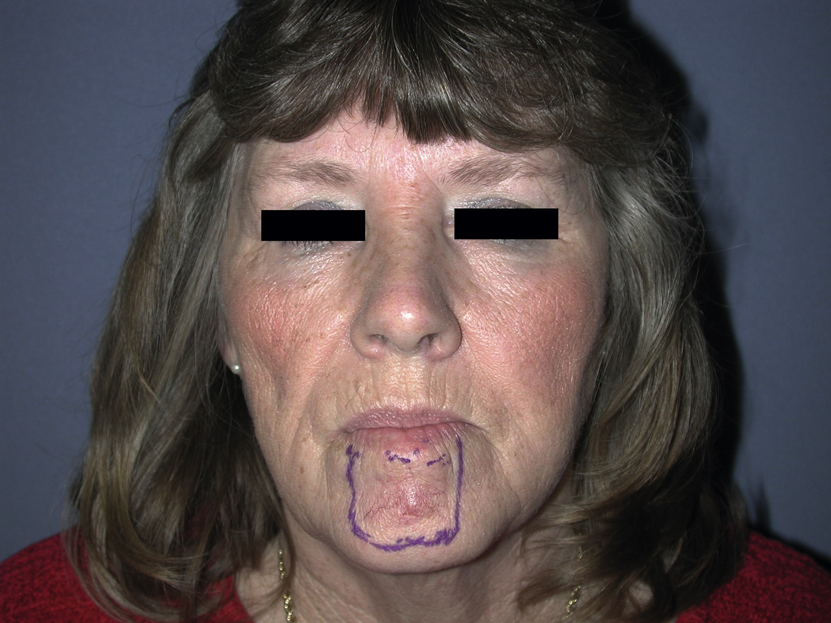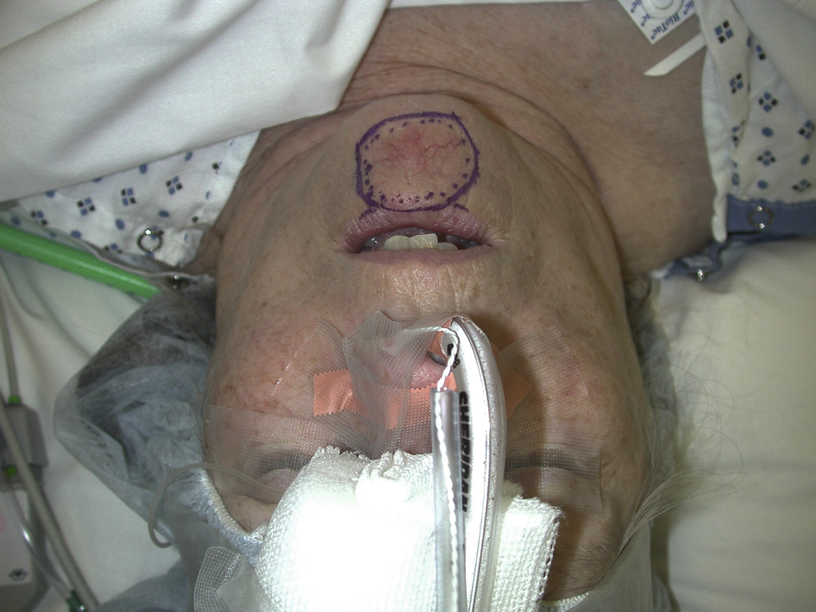 A preoperative view showing a skin lesion of cancerous appearance in the central part of the patient’s lower lip.