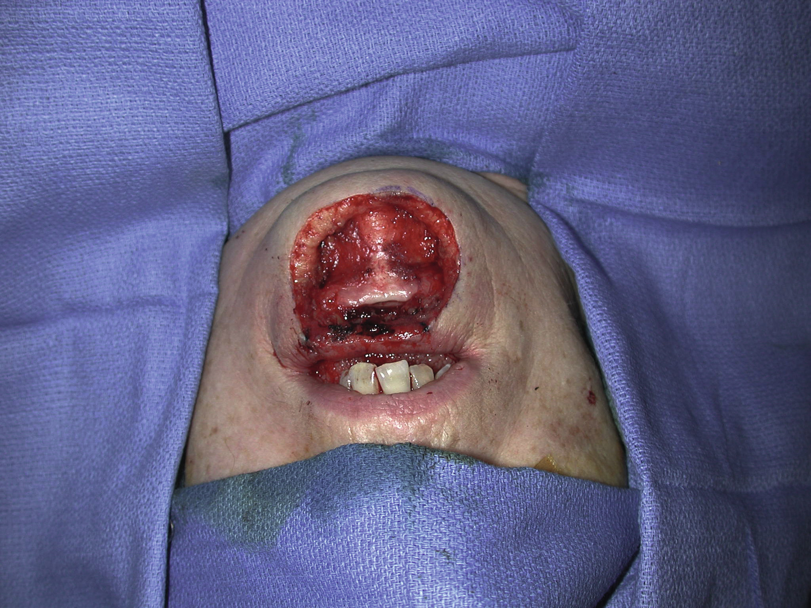 An intraoperative view showing a large lower lip central defect after complete excision of the basal cell cancer lesion.