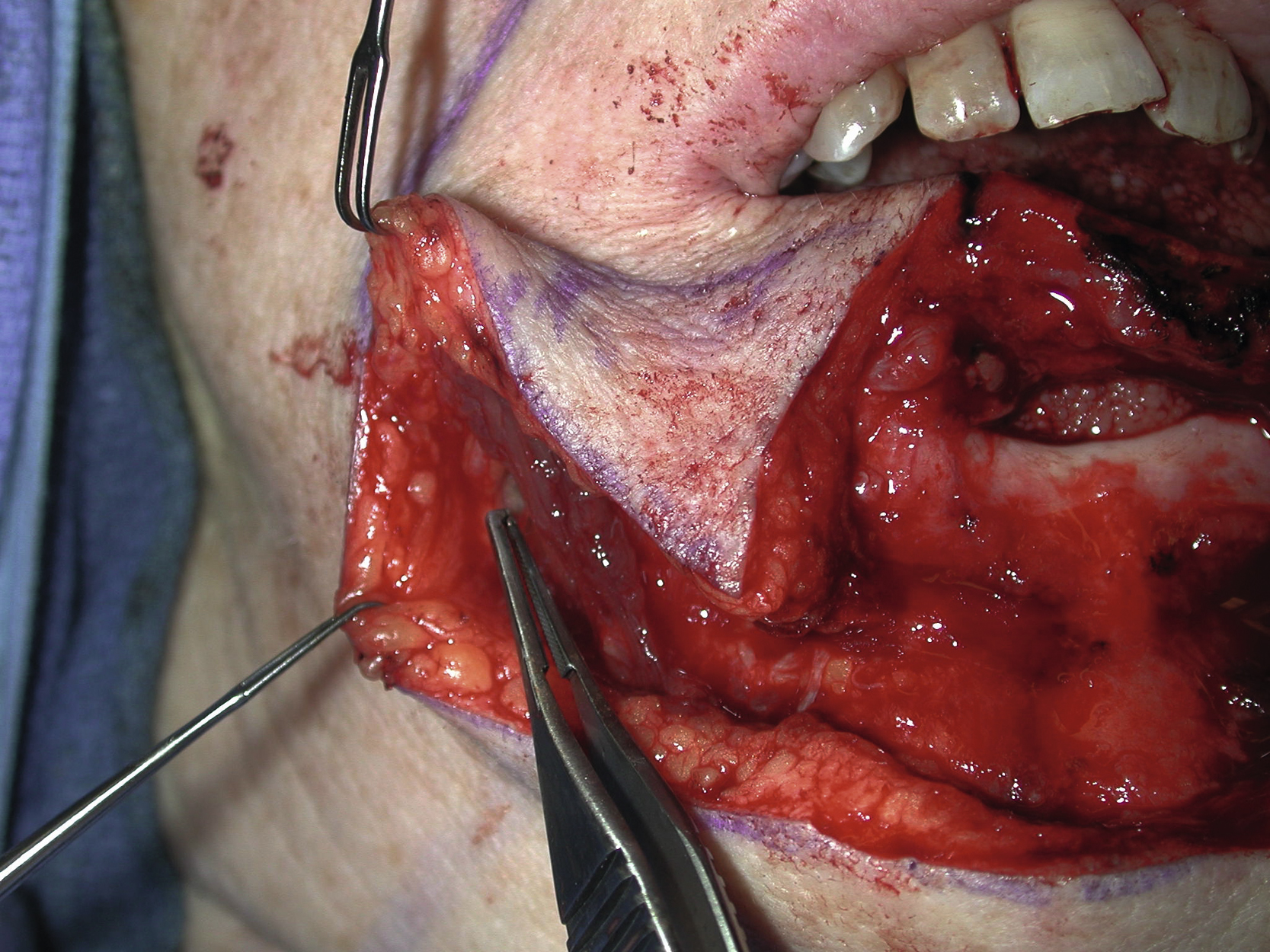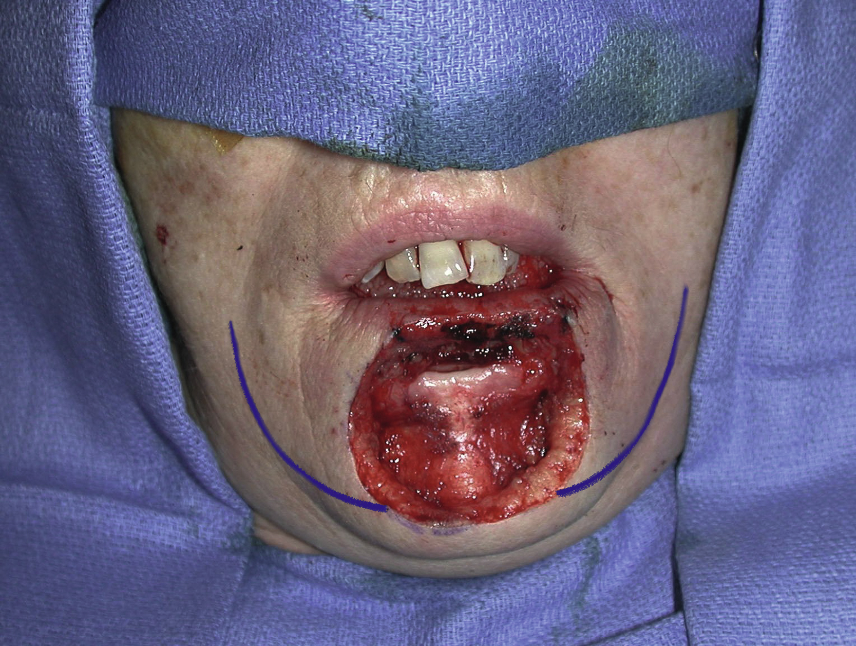 An intraoperative view showing the design of bilateral Karapandzic flaps for closure of this large lower lip defect.
