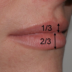 In the Caucasian patient the upper lip constitutes one-third of the total lip volume while the lower lip constitutes about two-thirds of the total lip volume, with a ratio of about 1:1.6 ( Fig. 4 ). African American lips are generally larger in all dimensions, and the upper and lower lip volumes are frequently nearly the same in many patients. Ethnic lips are also more protrusive, in part due to having more soft tissue mass. The normal chin and lip soft tissue thickness is approximately 12 mm in Caucasians and 15 mm in African Americans. Vermilion height norms vary in different ethnicities; for example, on average, African American males have 13.3-mm upper lips and 13.2-mm lower lips, and African American females have 13.6-mm upper lips and 13.8-mm lower lips. North American Caucasian vermilion height norms of upper and lower lip for males and females are 8.0 and 8.7 mm and 9.3 and 9.4 mm, respectively. In the normal situation there is a 0- to 3-mm intralabial gap between the lips in repose. Patients with larger intralabial space may not be good surgical candidates. The importance of ruling out dentofacial deformities as contributing factors to macrocheilia cannot be overstressed, and orthodontic, oral, and maxillofacial consultation and lateral cephalogram may be of assistance.