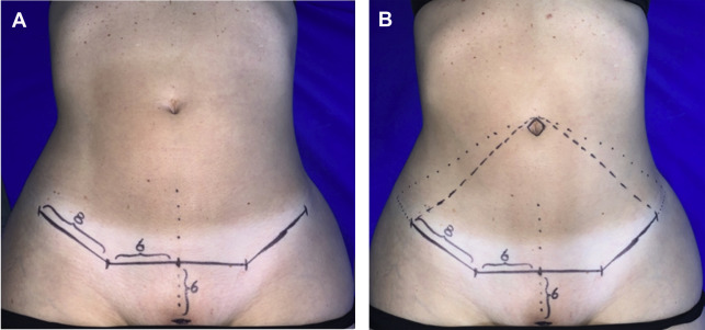 Personalized abdominal markings. ( A ) Inferior incision design (12-cm horizontal suprapubic line) at 6 cm from the vulvar commissure. Two oblique lines of 8 cm each are drawn in the direction of the iliac crest within the bikini line; dotted lines show an extended marking if excessive skin flaccidity exists. ( B ) Supraumbilical limit of the abdominal flap to be resected is marked and joined to the inferior lateral limit of the incision.