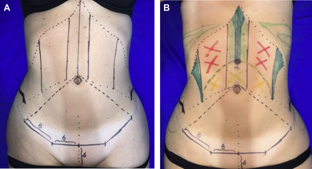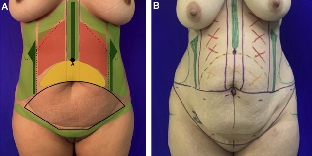 Individualized markings in standing position. ( A ) Schematic representation of markings. ( B ) Real patient markings. Black/purple lines , possible resection areas of abdominal skin, medial and lateral rectal muscle margin, rhomboidal design of umbilicus, incisions for liposuction on the abdominal skin to be resected, and possible neoumbilicoplasty position (point A). Red area , over rectus abdominal muscles (perforators area), note that over the costal margin more liposuction can be performed, that is why in the schematic it is marked as light green . Yellow area , flap perfusion risk area. Light green areas , safe area for intense deep liposuction. Dark green areas , area to be defined (alba line and semilunaris lines), note that the subcostal triangle is marked 2 cm over the costal margin because it descends with flap transposition.