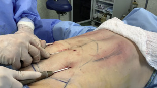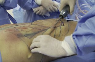 Super wet technique is used, infiltrating all the abdominal region with saline solution and adrenaline (1:500,000), between 1 and 2 L in the abdominal area, prioritizing the areas where more intense liposuction will be performed. The incorporation of an infiltration pump and cannulas can significantly diminish the infiltration time ( Fig. 5 ).