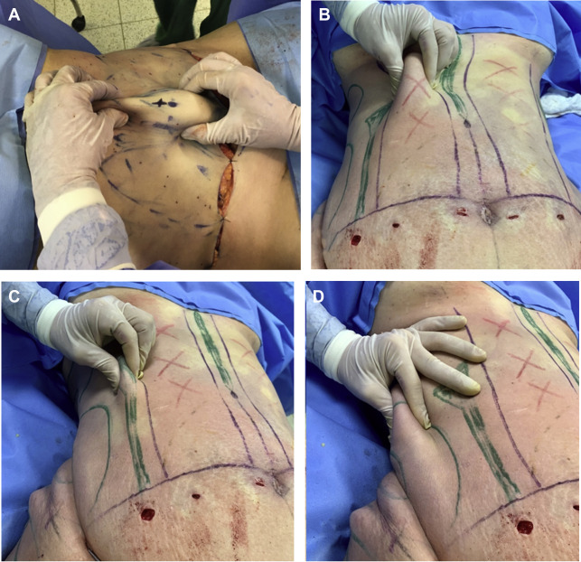 Pinch test of different areas. ( A ) Definition of alba line ( dark green area ) versus yellow area of the flap. ( B ) Perforators area ( red area ). ( C ) Definition of semilunar line ( dark green area ). ( D ) Flank area ( light green area ).