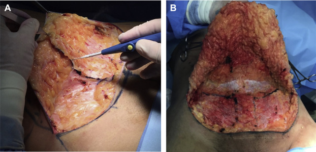 Next, liposuction of the red area is done in a deep and controlled way, trying not to injure any perforators of the rectus abdominis. Deep liposuction is done in the yellow area. The pinch test should be between 2.5 and 3 cm, superficial, and some deep fat is also maintained because at the time of resecting the abdominal flap the remaining fat in this area can be resected directly, avoiding excessive trauma to this distal flap region (see Fig. 7 ).